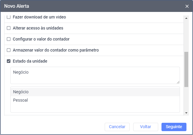 Esta ação permite registrar o estado da unidade: Negócio ou Pessoal. Para isso, é necessário ter o direito de acesso Gerenciar eventos à unidade. Por exemplo, quando a unidade passa por uma determinada cerca eletrônica, o status da unidade pode ser alterado de pessoal para comercial ou vice-versa.