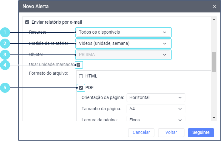 Se necessário, habilite a opção Usar unidade acionada. Esta opção está disponível apenas para relatórios por unidade ou grupo de unidades. Se a opção estiver habilitada, o relatório é executado apenas na unidade que acionou o alerta, independente do objeto selecionado na lista anterior.