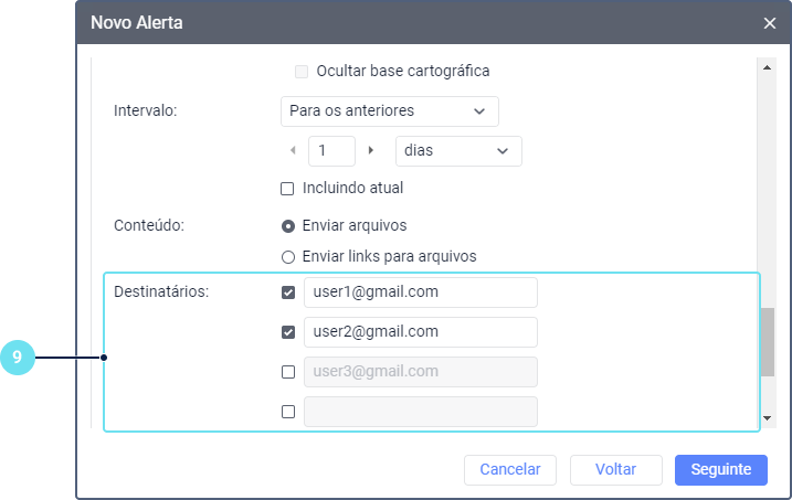 Esta ação permite configurar o envio de alertas por e-mail. Para isso, marque a caixa de seleção à esquerda do campo e especifique o endereço de e-mail para o qual os alertas devem ser enviados. Um novo campo aparece automaticamente após cada endereço digitado. Para cancelar o envio de alertas para qualquer um dos e-mails especificados, desmarque a caixa à esquerda do endereço de e-mail desejado.