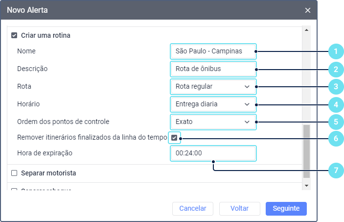 Esta ação permite separar automaticamente o motorista da unidade. Se vários monoristas forem vinculados a uma unidade, todos os motoristas serão separados depois que o alerta for ativado.Os motoristas e o alerta devem pertencer ao mesmo recurso.