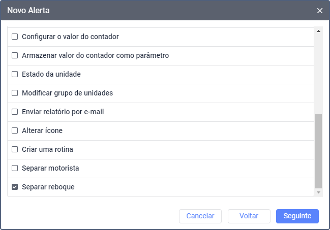 Esta ação permite separar automaticamente o reboque da unidade. Se vários reboques forem vinculados a uma unidade, todos os reboques serão separados depois que o alerta for ativado. Os reboques e o alerta devem pertencer ao mesmo recurso.