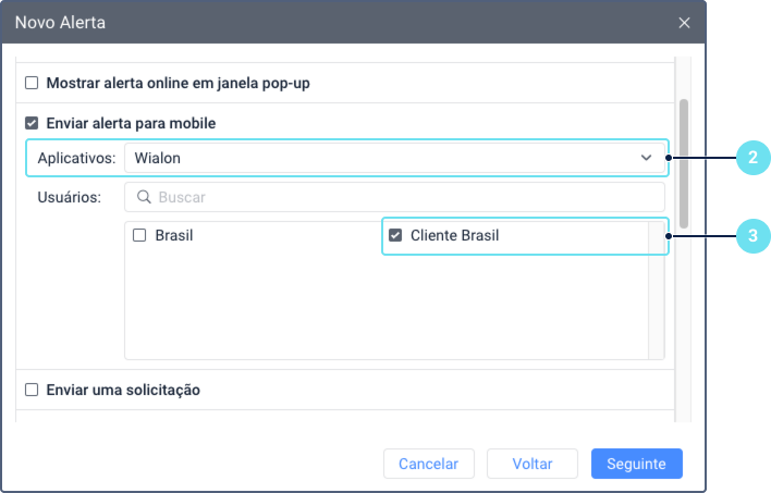 Esta ação da alerta permite exibir alertas em uma janela pop-up no Wialon (veja mais).