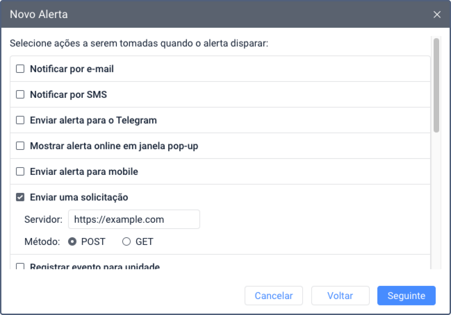 Esta ação permite enviar mensagens sobre alertas acionados para servidores de terceiros. Para configurar isso, siga as etapas abaixo.