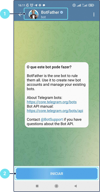 - Toque em Iniciar. Depois disso, o ID do usuário será enviado. Para descobrir o ID de outro usuário, envie uma mensagem qualquer para esse bot em nome do usuário desejado.