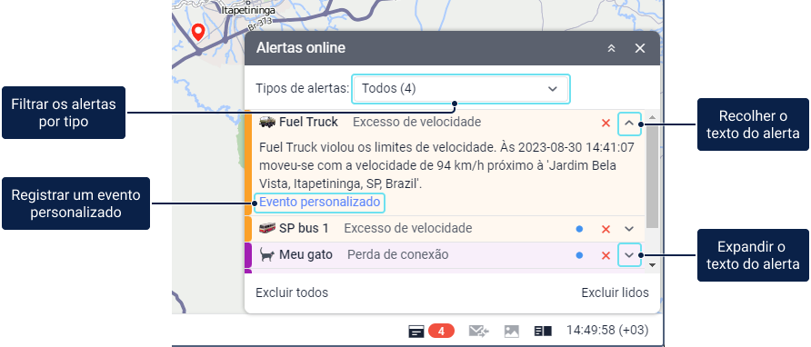 Após clicar no nome do alerta, o mapa fica centralizado no local onde o evento ocorreu. Após clicar no nome da unidade, o mapa é centralizado na última posição dela. A unidade também é adicionada à lista de trabalho na aba Monitoramento e no mapa.