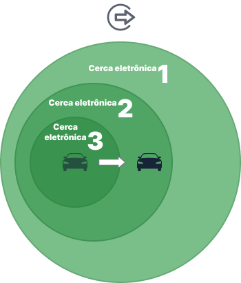 | OU | O alerta é acionado quando a unidade sai de qualquer uma das cercas eletrônicas selecionadas, caso já tenha estado em todas elas ao mesmo tempo. Exemplo. A Cerca eletrônica 1, a Cerca eletrônica 2 e a Cerca eletrônica 3 estão selecionadas nas configurações de alerta. A Cerca eletrônica 3 está dentro da Cerca eletrônica 2 e da Cerca eletrônica 1. A unidade está na Cerca eletrônica 3 e, portanto, em todas as três áreas geográficas ao mesmo tempo. Quando ela deixa a Cerca eletrônica 3, mas ainda permanece na Cerca eletrônica 2 e na Cerca eletrônica 1, o alerta é acionado. O alerta também é acionado se a unidade se mover da Cerca eletrônica 3 para a Cerca eletrônica 1 ou deixar todas as cercas eletrônicas de uma vez. Se a unidade estava na Cerca eletrônica 2 ou na Cerca eletrônica 1 e saiu delas, o alerta não será acionado. |