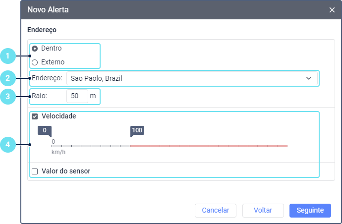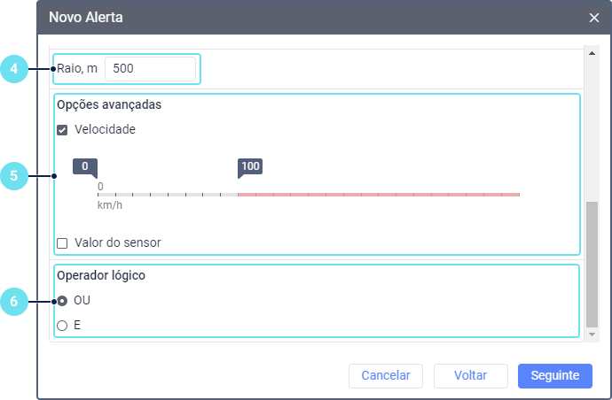 No campo Raio, especifique a distância entre as unidades que, se aumentada ou diminuída, aciona o alerta.