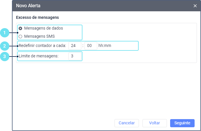 No exemplo da imagem acima, o alerta é acionado se 3 ou mais mensagens SMS forem recebidas da unidade dentro de 24 horas.