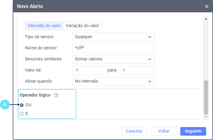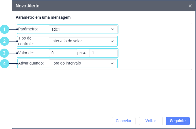 - Fora do intervalo. O alerta é ativado ao receber valores que não se enquadram no intervalo especificado.