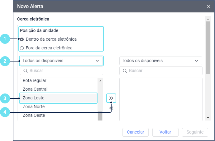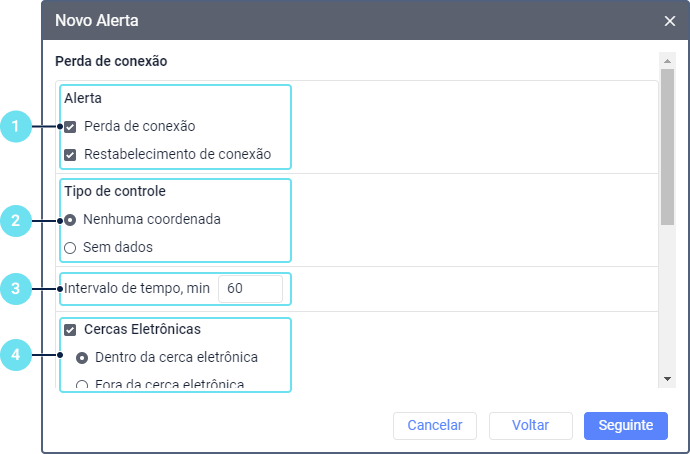 Abaixo estão as etapas para configurar um alerta do tipo Сerca eletrônica.