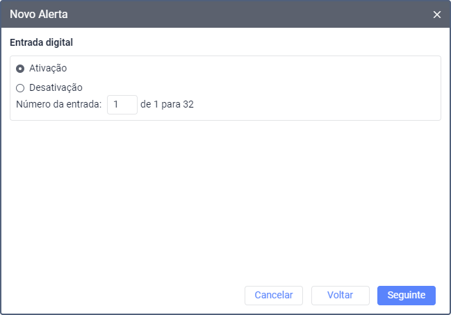 Um alerta deste tipo é acionado se uma entrada digital do dispositivo for ativada ou desativada. Para configurar o alerta, especifique o número da entrada nas abas Ativação ou Desativação, respectivamente.
