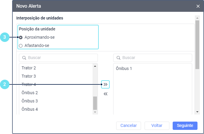 Selecione a situação em que deseja receber o alerta: quando uma unidade selecionada na etapa 1 estiver se afastando ou se aproximado de outra unidade.