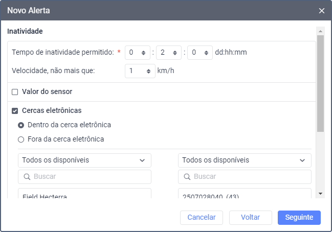 | Tempo de inatividade permitido | Especifique por quanto tempo uma unidade pode permanecer estacionária antes que o alerta seja acionado. Este valor não pode exceder 30 dias. |
