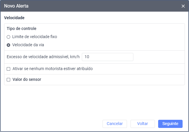 Se necessário, defina condições adicionais para o alerta: a velocidade da unidade selecionada na etapa 1, e o valor do sensor. A última opção é configurada da mesma forma que o tipo de alerta Valor do sensor.