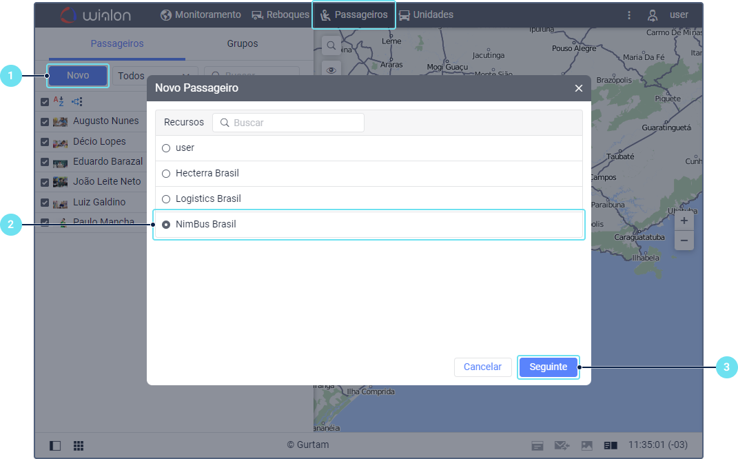 Selecione o recurso no qual deseja criar um passageiro caso tenha mais de um recurso disponível.