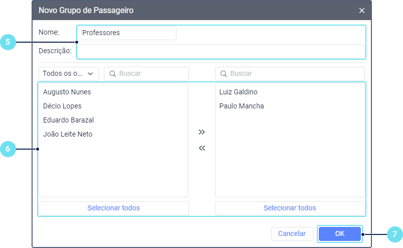 Selecione os passageiros que deseja adicionar ao grupo. Para isso, selecione os passageiros desejados na lista à esquerda e mova-os para a lista à direita clicando no ícone
