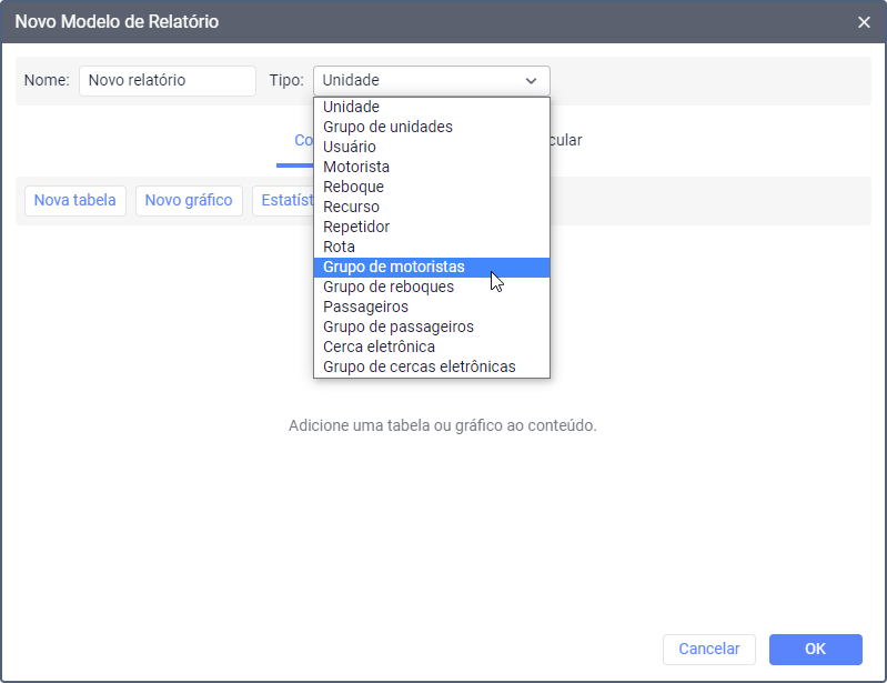 Os relatórios avançados não incluem a tabela Histórico dos relatórios dos tipos Grupos de unidades e Usuário.