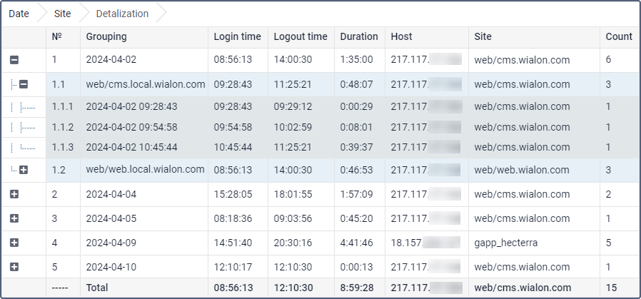 As mesmas configurações aplicadas a todas as outras tabelas podem ser usadas na tabela de logins do usuário: agrupamento, detalhado, numeração de linhas, linha de total e limitações de tempo. No exemplo abaixo, você pode ver a tabela de logins do usuário com agrupamento por dias, detalhado, numeração e linha de total.