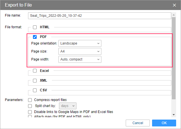 Anexar mapa (somente para PDF e HTML) | Esta opção permite anexar um mapa ao relatório. Para isso, as opções relacionadas à exibição de marcadores, percursos e/ou localização da última unidade devem ser habilitadas nas configurações do modelo. Se tais elementos não estiverem disponíveis, o mapa não será anexado. Apenas o Gurtam Maps pode ser anexado ao relatório. |