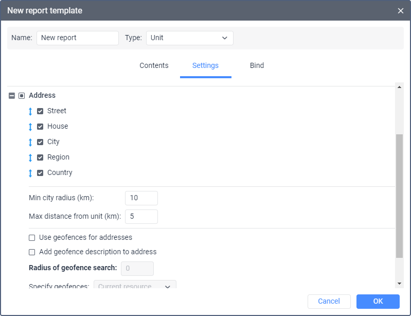 | Distância máxima da unidade | Se a unidade estiver na estrada e a uma distância especificada dela houver uma cidade, o nome da estrada e a distância para esta cidade entram em seu endereço. |