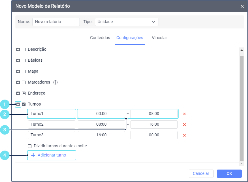 Na seção Turnos é possível configurar turnos de trabalho que devem ser usados para estruturar as informações nos relatórios. Isso pode ser útil se vários motoristas trabalharem com a mesma unidade, mas em momentos diferentes. Por exemplo, um motorista trabalha das 9h às 17h e outro das 21h. às 5h. Neste caso é possível adicionar dois turnos e executar um relatório levando em consideração os dados recebidos apenas durante esses turnos de trabalho
