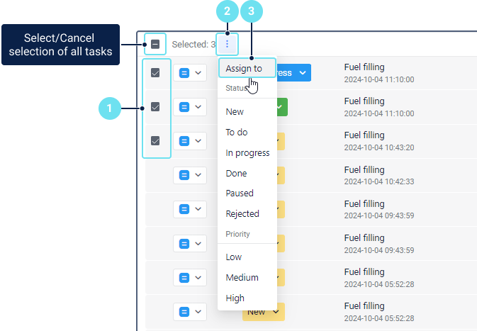Você pode alterar a prioridade, o status e atribuir um funcionário a várias atividades de uma só vez.
