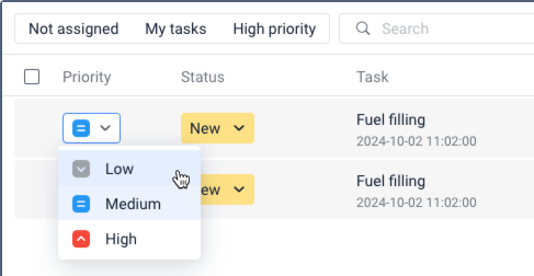 Para alterar a prioridade de uma única atividade, clique no campo na coluna Prioridade e selecione a opção necessária: baixa, média ou alta.