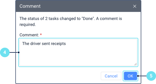 Se você selecionou Concluído, Em pausa ou Recusado, deixe um comentário. Comentários também são necessários ao alterar o status da atividade de Concluído ou Recusado para qualquer outro. Os comentários são limitados a 50 caracteres.**