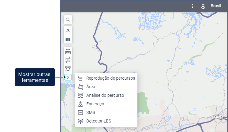 O menu de ferramentas está localizado no lado esquerdo do mapa. Por padrão, apenas os ícones das três primeiras ferramentas são mostrados. Para ver os outros, clique no ícone