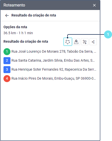 Em seguida o mapa exibirá a rota construída de acordo com os pontos adicionados e as configurações especificadas. Para alterar os pontos ou configurações e refazer a rota, clique no ícone
