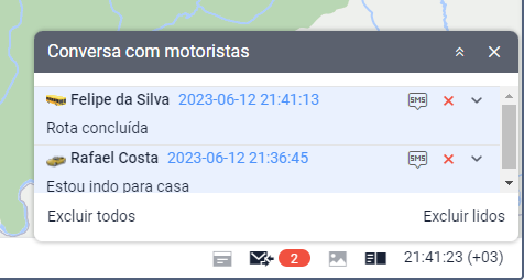 As mensagens enviadas pelo motorista são mostradas no histórico e na janela Conversa com motoristas da mesma forma que os comandos enviados pelo equipamento. Nesta janela, é possível responder às mensagens do motorista clicando no ícone