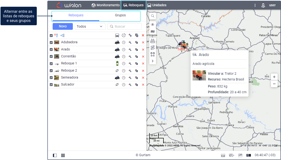 Para trabalhar com reboques, clique na aba Reboques no painel superior ou selecione um item com esse nome no menu principal. É possível trabalhar com reboques e também com grupos de reboques.