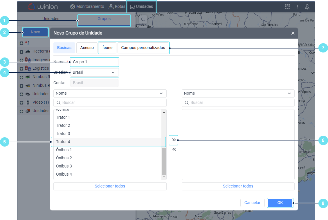 É possível usar grupos de unidades na aba Monitoramento, em relatórios, trabalhos e nos alertas.