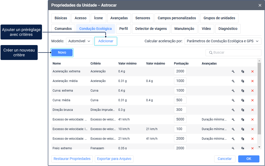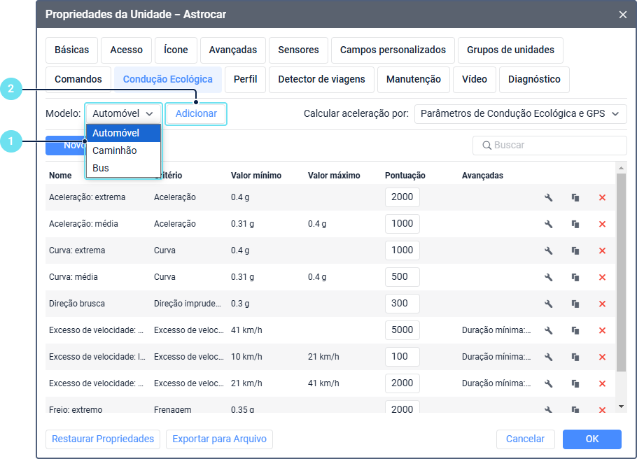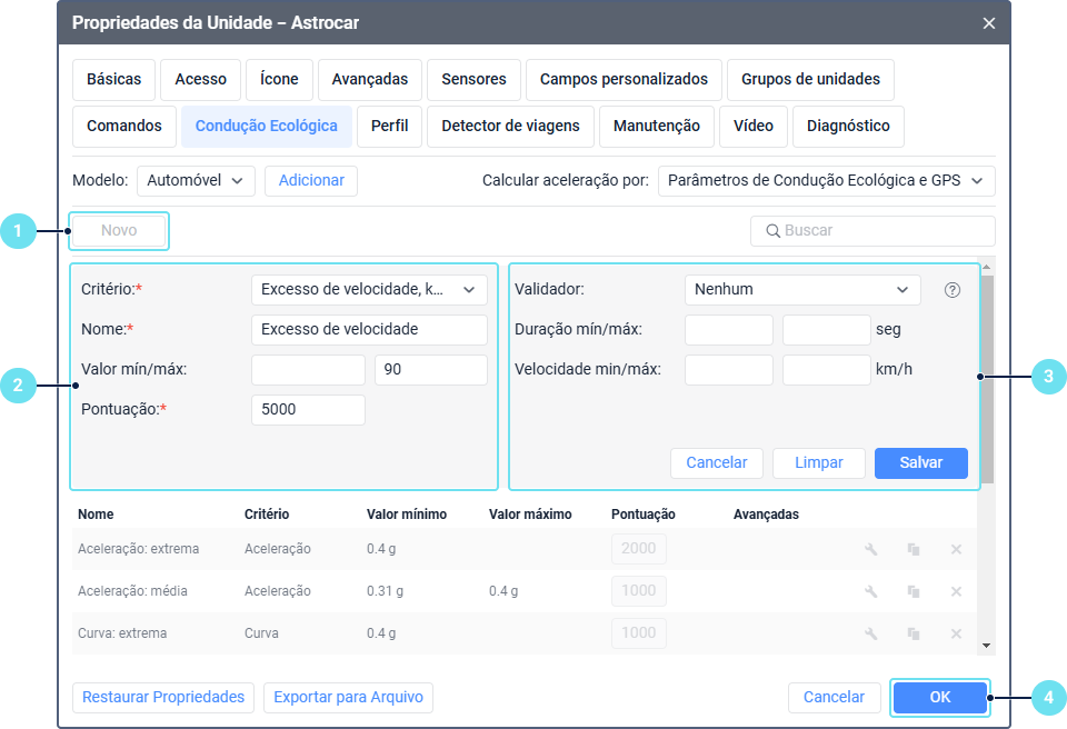 Nesta aba é possível selecionar o método que deve ser usado para calcular a aceleração e adicionar critérios que permitem avaliar a qualidade da condução e detectar infrações. Isso é necessário para melhorar a segurança da condução, manter a qualidade das mercadorias transportadas e reduzir os custos de combustível.