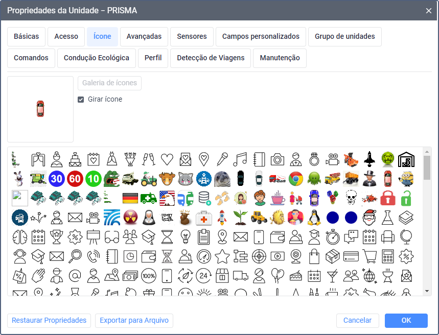 Nesta aba de propriedades da unidade é possível selecionar um ícone que será usado para identificar a unidade no mapa e nas listas de unidades.