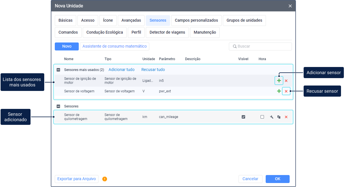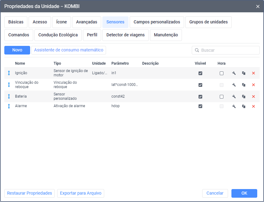 Nesta aba é possível criar, copiar e excluir sensores para a unidade, configurar suas propriedades, visibilidade e ordem. Além disso, também é possível acessar o Assistente de consumo matemático.