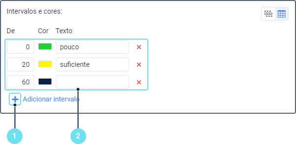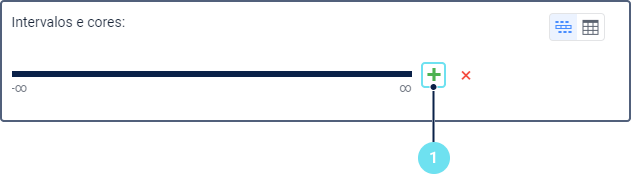 Nesta seção é possível criar intervalos de valores do sensor, selecionar uma cor e especificar uma legenda para cada intervalo. Os intervalos devem ser especificados para os valores do sensor obtidos após a aplicação de todas as transformações: parâmetros da expressão, tabela de cálculo e validação.