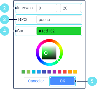 - No campo De, insira o valor inicial do primeiro intervalo, selecione uma cor e especifique uma legenda. Se o campo De estiver vazio, considera-se que -∞.
