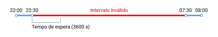 Exemplo. Suponha que as mensagens de dados de um sensor digital personalizado foram recebidas às 22:00, 22:30, 07:30 e 08:00. Se a opção Tempo de espera estiver habilitada, o relatório mostra um intervalo contínuo entre 22:00 e 08:00. Ao especificar um tempo de espera de 1 hora (3600s), vários intervalos serão formados. Como a diferença entre a primeira e a segunda mensagem é inferior a uma hora, elas formam o primeiro intervalo (das 22:00 às 22:30). A diferença entre a segunda e a terceira mensagem é superior a uma hora, portanto este intervalo (das 22:30 às 07:30) é considerado inválido e não é levado em consideração. A diferença entre a terceira e a quarta mensagens é inferior a uma hora, portanto elas formam o segundo intervalo (das 07:30 às 08:00).