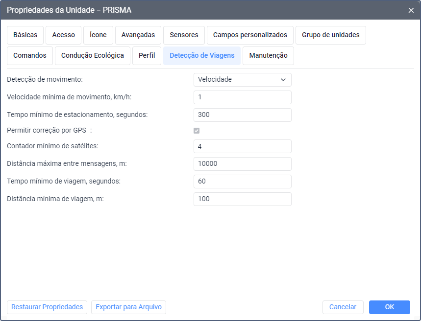 Nesta aba é possível selecionar o método o qual deve ser usado para detectar movimento e especificar valores de parâmetros que devem ser levados em consideração em uma viagem, parada e intervalos de estacionamento.