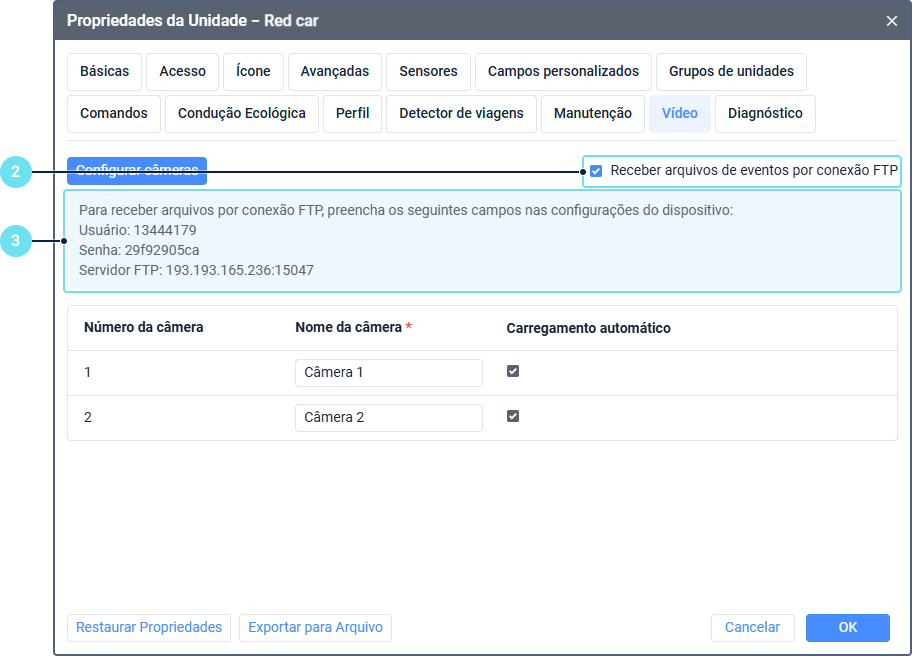 Na aba Vídeo das propriedades da unidade, ative a opção Receber arquivos de eventos por conexão FTP. Você pode ver os detalhes da conexão FTP no aviso que aparece.