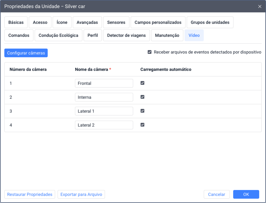 Na aba Vídeo das propriedades da unidade é possível configurar câmeras para obter transmissões ao vivo, vídeos gravados e salvar arquivos.