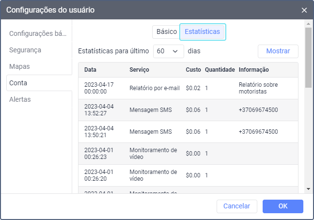 Na seção Estatísticas é possível obter informações sobre taxas de serviço para um período de até 60 dias. Para isso, selecione o intervalo de tempo desejado e clique em Mostrar.