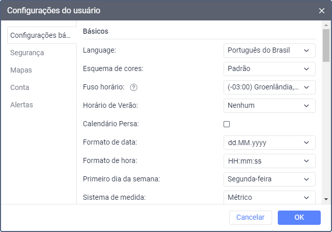 Selecione um dos sistemas de medição disponíveis. Essa configuração é levada em consideração ao criar rotas, usar ferramentas e calcular distâncias de unidades a cercas eletrônicas e cidades. O sistema de medição selecionado também é usado ao exibir os valores dos sensores na lista de trabalho, nas dicas de contexto de unidades e de trajetos, caso o usuário não tenha editado a unidade de medida dos sensores. Esta configuração também afeta as unidades de medida do nível de combustível no aplicativo para Android/iOS.