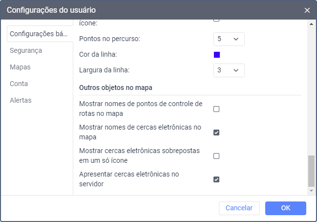 Nesta seção é possível configurar a maneira como os pontos de verificação de rota e as cercas eletrônicas são exibidos no mapa.