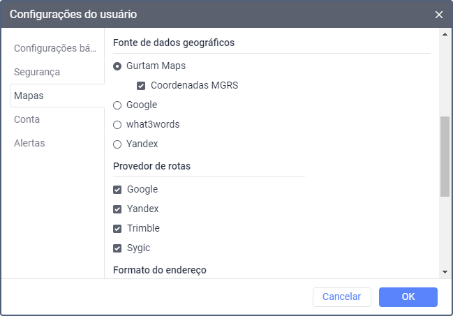 Se você selecionar qualquer fonte de geodados diferente do Gurtam Maps, a seção Formato do endereço ficará indisponível.