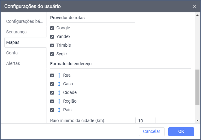 Nas seções Fonte do mapa, Proveedor de rotas e Formato do endereço é possível selecionar todos os itens de uma vez. Para isso, mantenha pressionada a tecla Ctrl e selecione qualquer item na seção desejada.