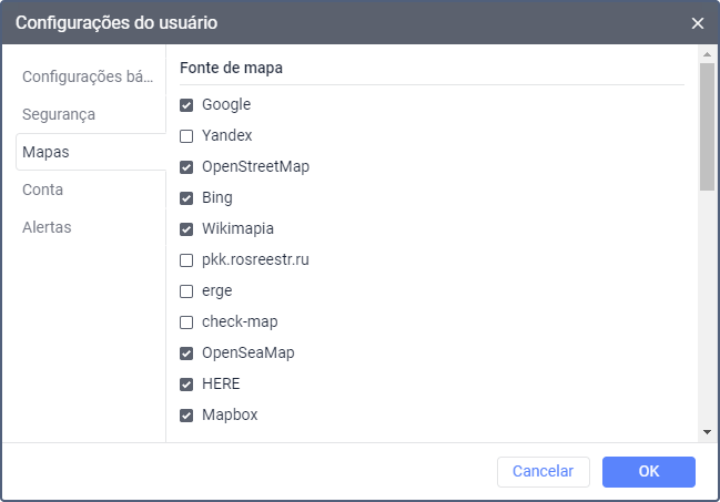 Nesta seção é possível habilitar as fontes de mapas desejadas que podem ser selecionadas posteriormente na lista de mapas base.