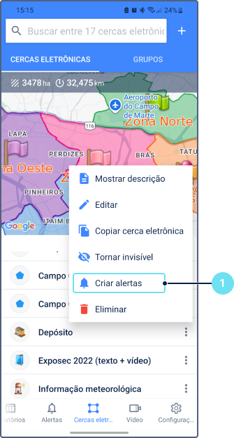 - Selecione a ação Criar alerta no menu da cerca eletrônica.