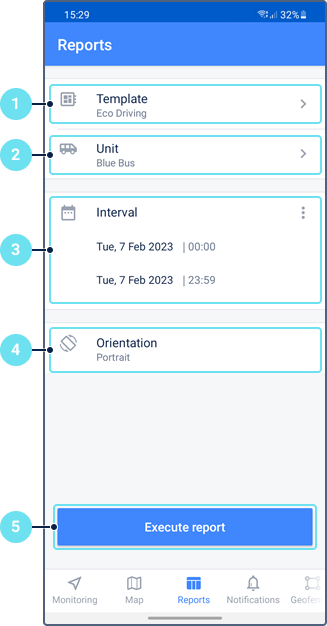 Nesta aba é possível utilizar os modelos de relatórios criados no Wialon para executar relatórios sobre: